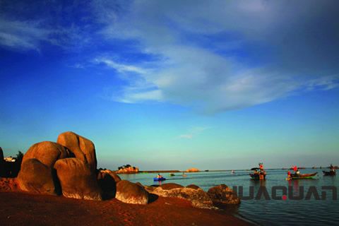 先說一下“三娘灣”,欽州“白海豚之鄉(xiāng)”的美譽正是得益于此。三娘灣位于犀牛腳鎮(zhèn)東5公里處,距欽州市區(qū)約38公里,南臨北部灣,背倚烏雷山。掩映在枝繁葉茂的紅樹林里的海灘潔白柔軟,站在如天外流星墜落海灘的三婆石上,朝可觀旭日東升,晚可賞夕陽斜照;還可拜烏雷伏波廟、游威德寺;更妙的是登上漁船出海觀光,品海鮮、沐海風,觀賞珍奇的中華白海豚,盡享藍天碧海、人歡魚躍的情趣。